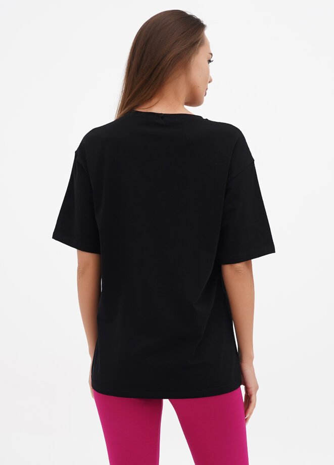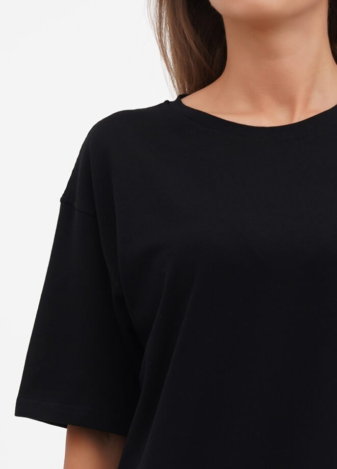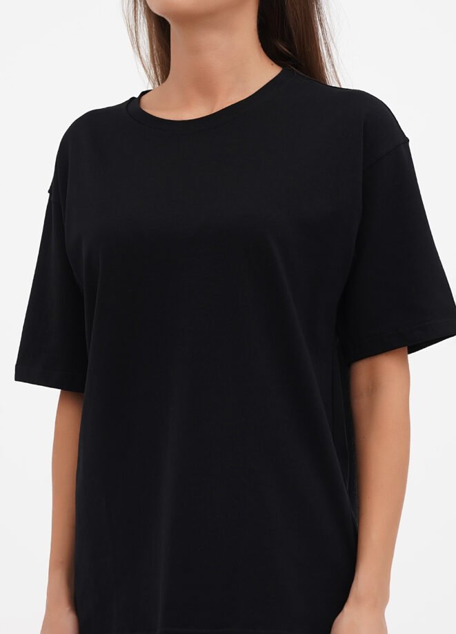 Ця чорна футболка для жінок в стилі оверсайз стане відмінним доповненням до вашого гардеробу. Виготовлена з куліру (100% бавовна), вона забезпечить вам комфорт та приємний відчуття на шкірі. Модель оверсайз надає футболці стильний та модний вигляд, а чорний колір додає класичності та універсальності, що робить її відмінним вибором для будь-якого образу.