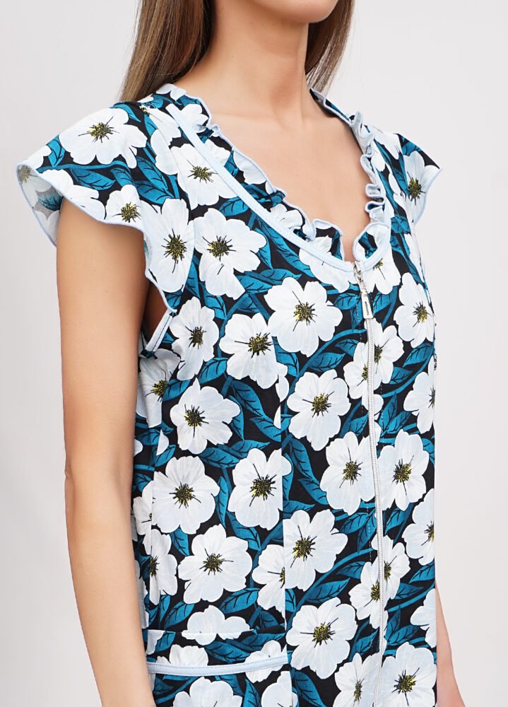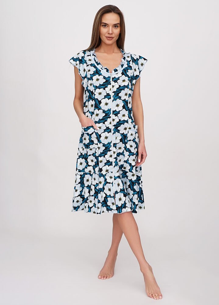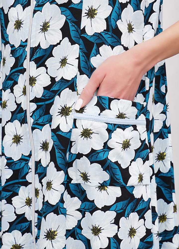 Цей літній жіночий халат з коротким рукавом стане вашим улюбленим вибором для теплих днів. Зручна застібка на блискавку дозволяє легко надягати та знімати халат, а кишені у боках додають практичності для зберігання дрібниць. Виготовлений з куліру (100% бавовна), він забезпечує максимальний комфорт та приємні відчуття на шкірі. Насолоджуйтесь легкістю та свіжістю у цьому чудовому халаті!