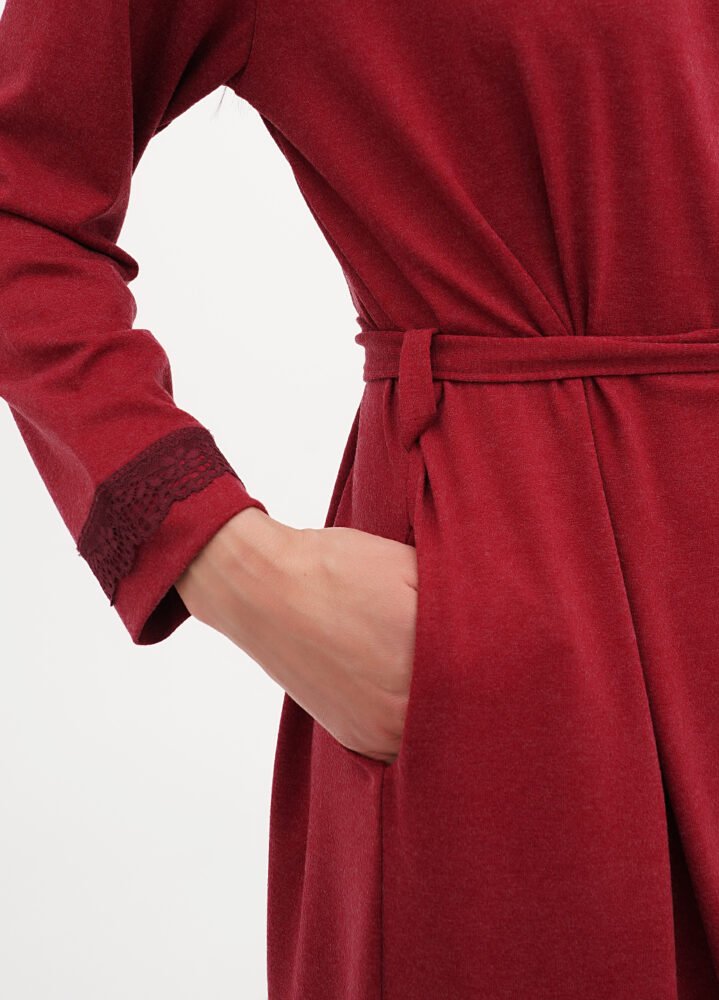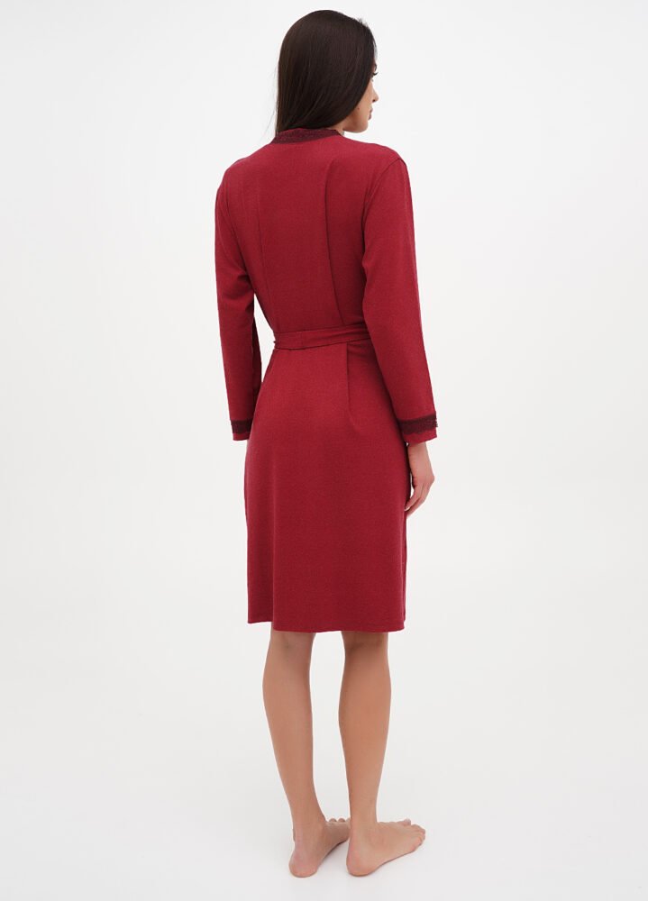 Цей багатий халат на запах стане ідеальним доповненням до вашого гардеробу. Полотно, виготовлене з  віскози, надає виробу ніжність та еластичність, що гарантує комфорт протягом усього дня. М’яка тканина дбайливо огортає тіло, а делікатне мереживо, яке прикрашає краї халата, додає йому особливого шарму та елегантності. Вільний крій забезпечує зручність, дозволяючи носити халат вдома або на відпочинку, створюючи образ розкоші та розслабленості.