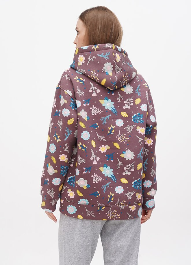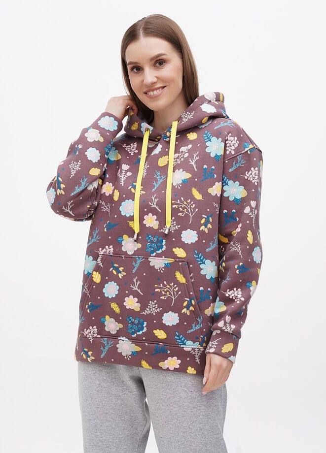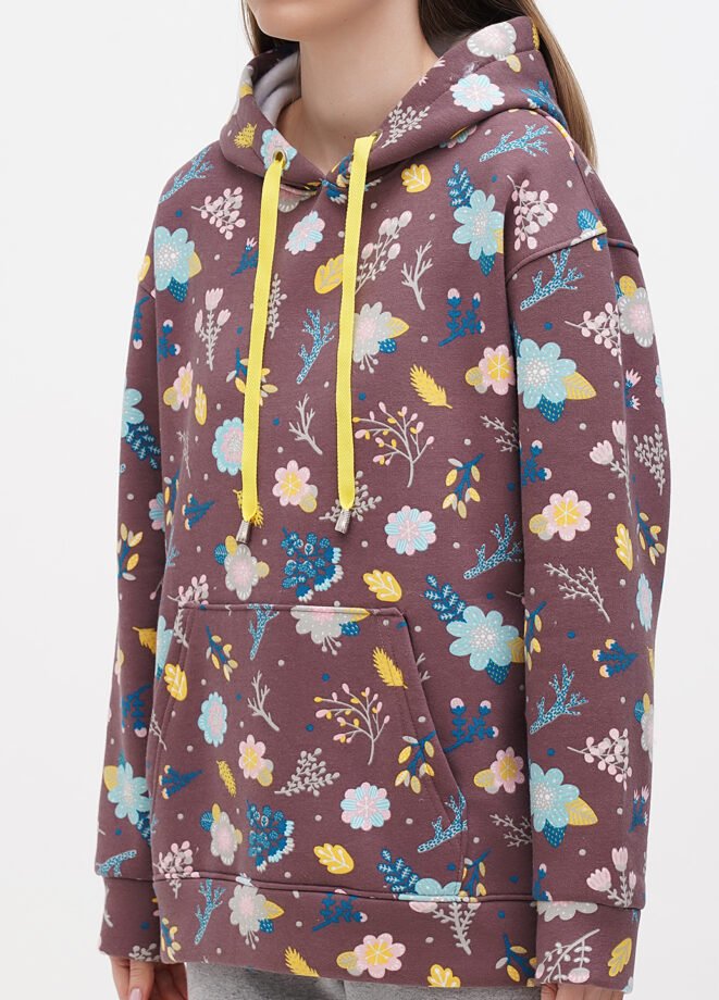 Жіночий теплий худі вільного крою. Із заниженою лінією плеча. На розмір 46 довжина виробу 70 см, довжина рукава 50 см. Полотно моделі – трьохнитка, з начосом.