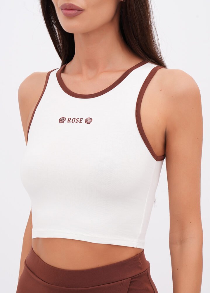 Топ: укорочений кроп-топ з контрастною окантовкою та написом. Щільно прилягає до тіла, підкреслюючи фігуру.