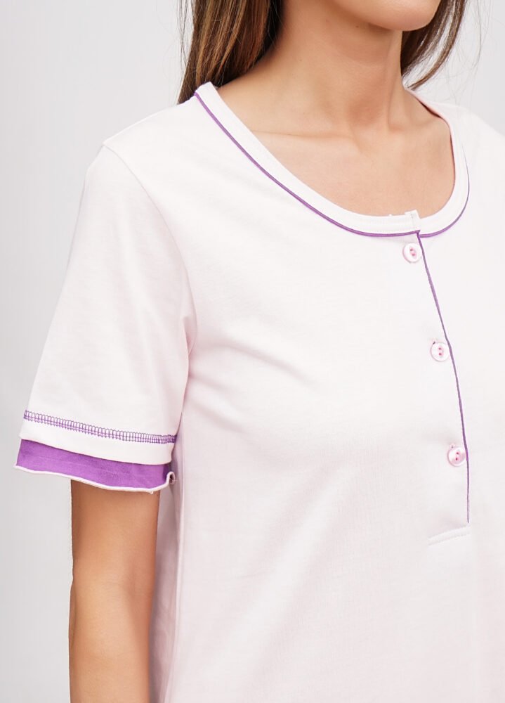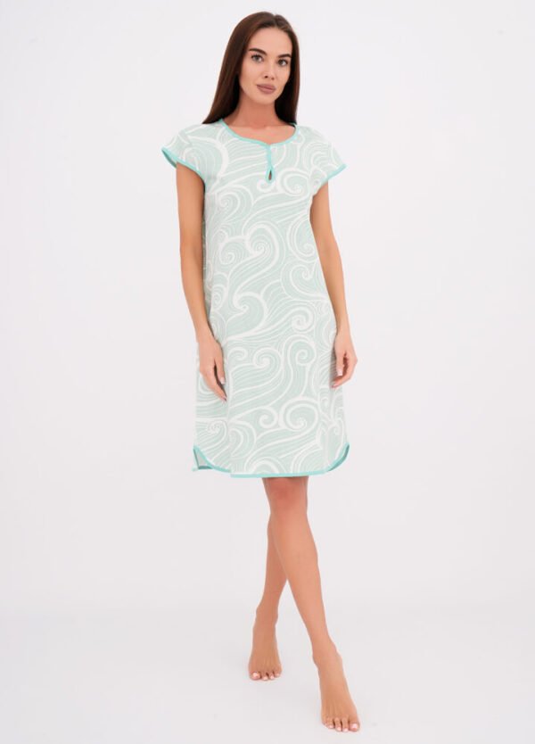 Ця жіноча нічна сорочка з друкованим малюнком привертає увагу своєю яскравістю та комфортом. Спереду сорочка має застібку на три гудзики, що додає їй зручності. У комплекті йде маска для сну, яка забезпечить вам спокійний та глибокий сон. Полотно виконане з куліру (100% бавовна), що забезпечує відмінну вентиляцію та комфорт у спекотні ночі.