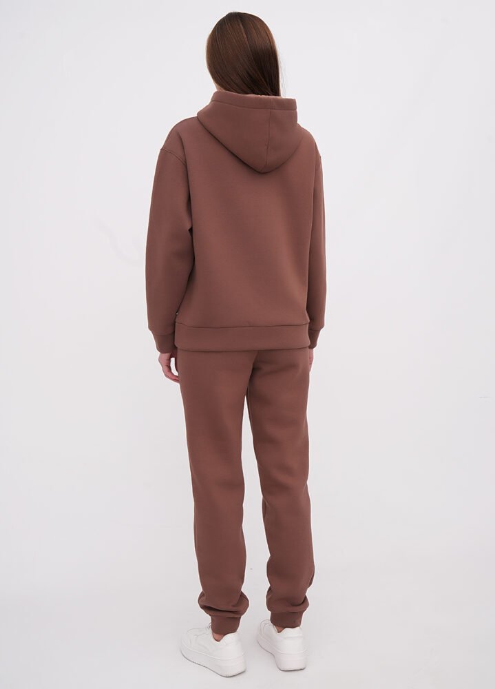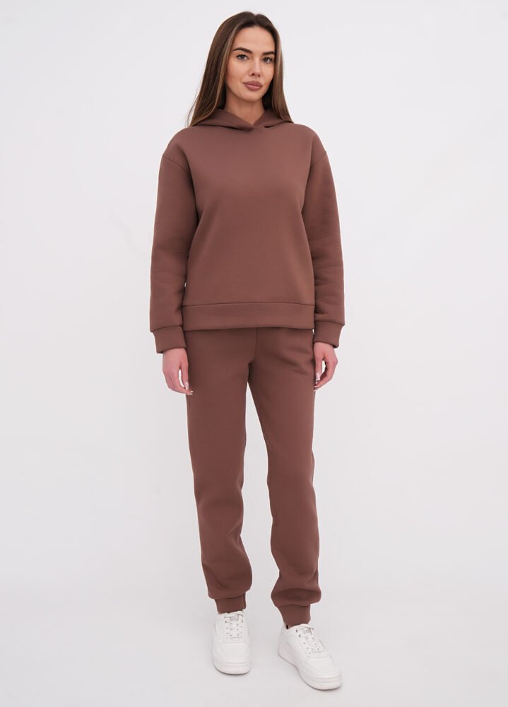 Базовий комплект із худі та штанів у спортивному стилі. Худі з капюшоном, спущеною лінією плеча та манжетами на рукавах. Штани з еластичним поясом і манжетами по низу забезпечують зручну посадку. Модель підходить для щоденного носіння, прогулянок та активного відпочинку. Тканина щільна, приємна до тіла, добре тримає форму.