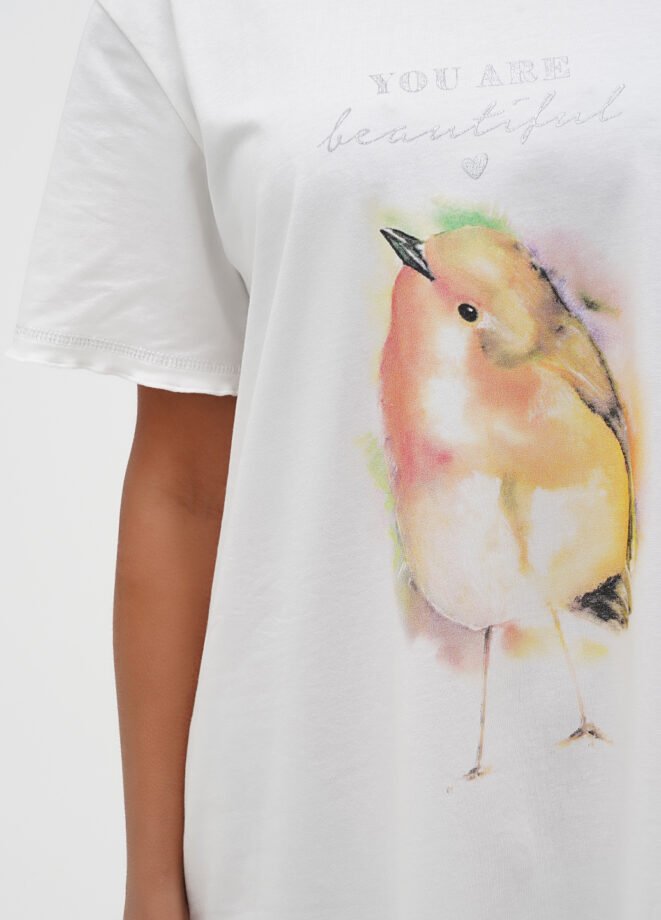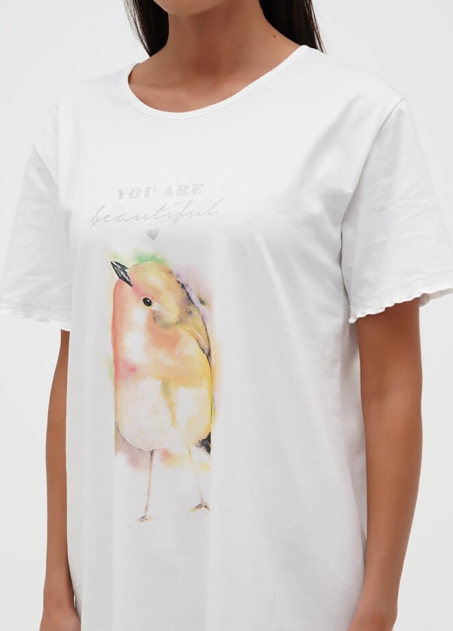 Ця жіноча нічна сорочка з коротким рукавом привертає увагу своїм вишуканим дизайном та високоякісним друкованим малюнком. Опіковка рукавів та низа додає ще більше шарму до цієї ніжної сорочки. Колір в пастельних відтінках надає їй ніжності та жіночності. Насолоджуйтеся комфортом і елегантністю у цій чудовій нічній сорочці!