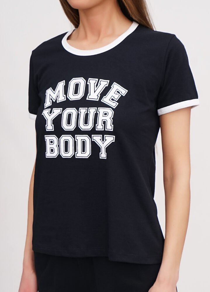 Футболка: Короткі рукави, круглий виріз горловини з контрастною облямівкою. На передній частині футболки великий напис.