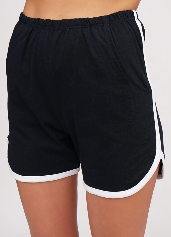 Шорти: Короткі, без кишень, з контрастними облямівками по краях.