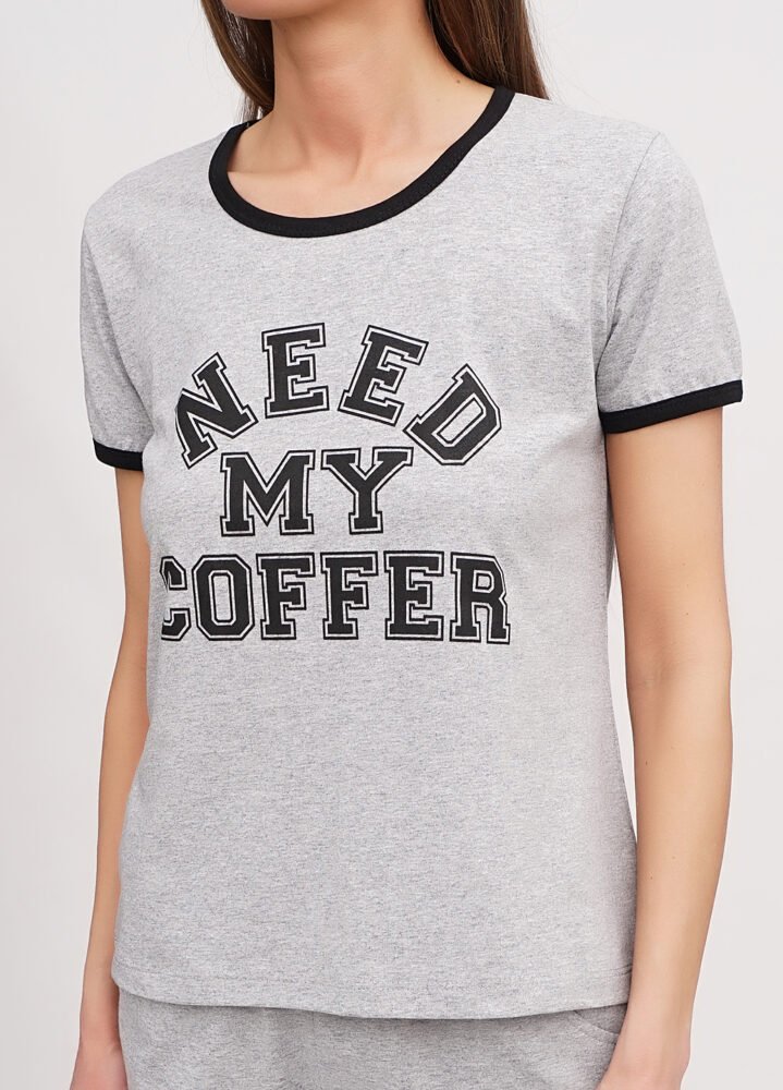 Футболка: Короткі рукави, круглий виріз горловини з контрастною облямівкою. На передній частині футболки великий напис.