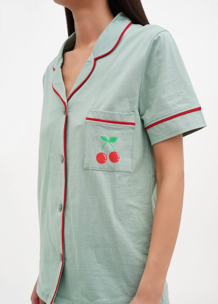 Ця оригінальна піжама виготовлена з натурального полотна, що містить 100% бавовни. Такий склад забезпечує приємне відчуття на шкірі, відмінну повітропроникність та легку еластичність, що дозволяє вільно рухатись під час сну. Комплект складається з сорочки на ґудзиках із короткими рукавами та довгих штанів з еластичним поясом. Яскравий жовтий колір, контрастна червона обробка та вишивка з мотивом вишеньок на кишені додають грайливості та настрою.