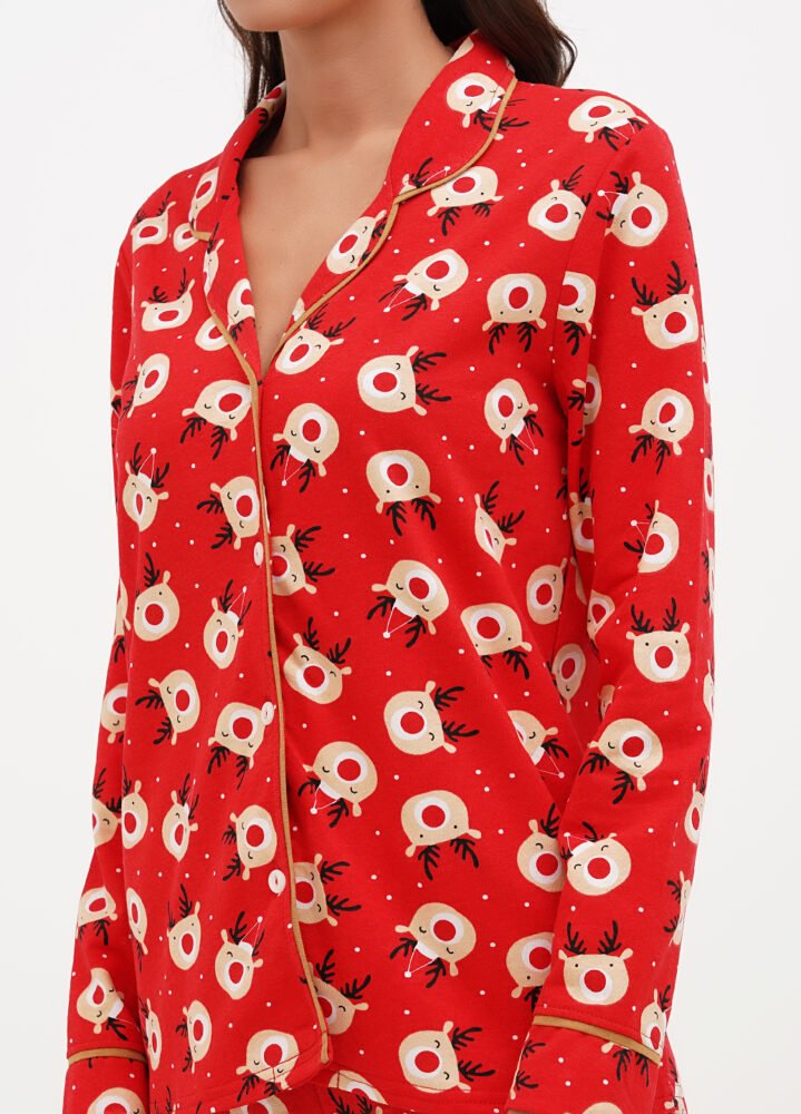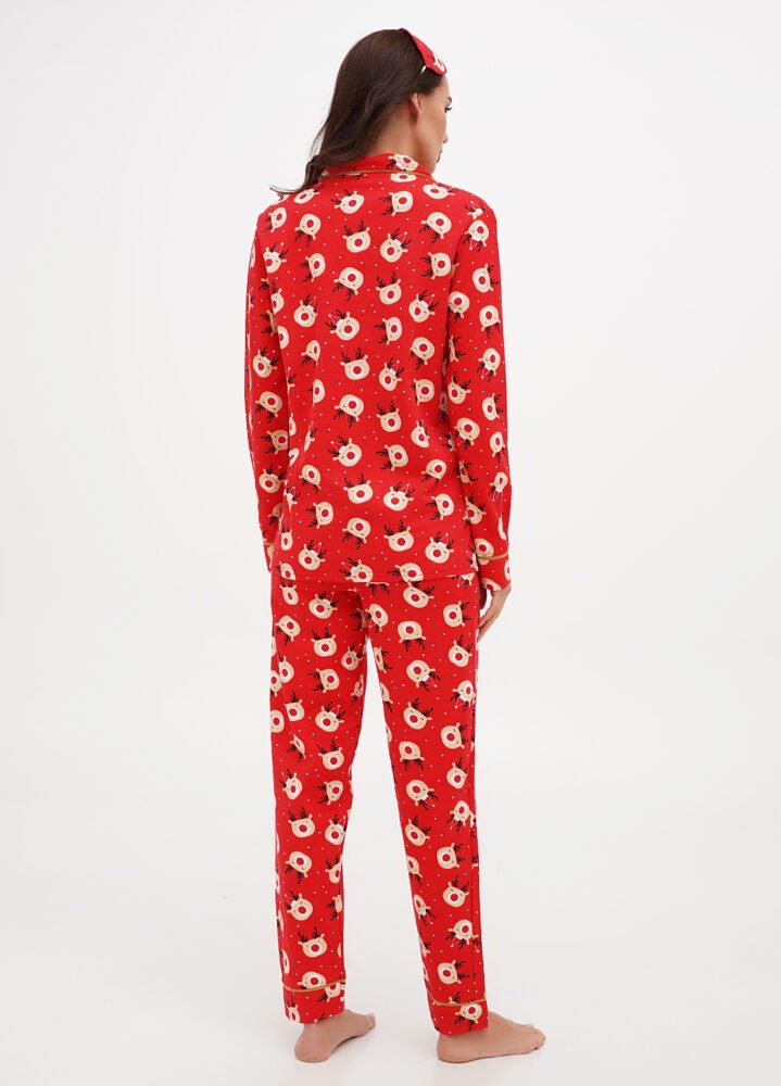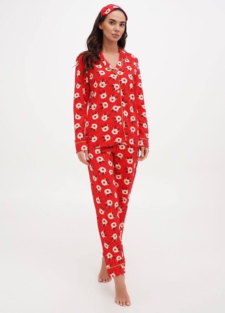 Цей святковий піжамний комплект виглядає просто чарівно! Новорічний принт налаштовує на зимовий настрій і додає відчуття наближення свят. А пов’язка для сну – чудове доповнення для максимального комфорту та затишку.
