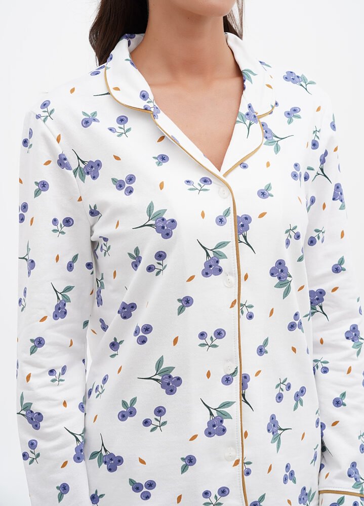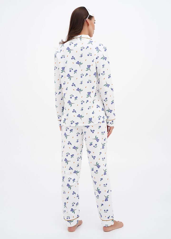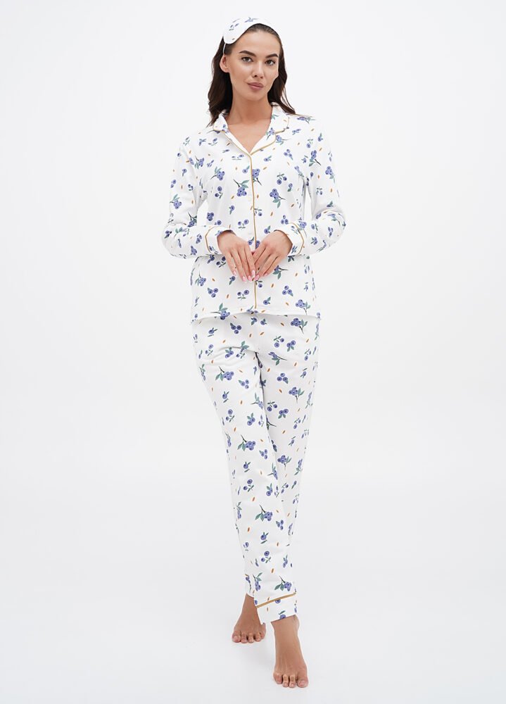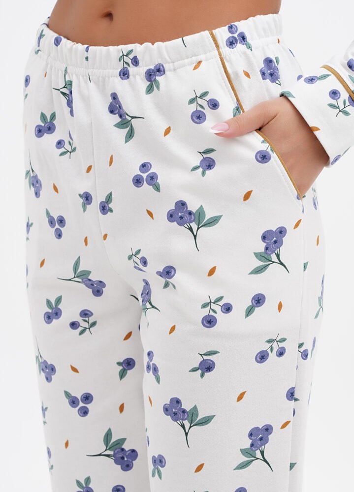 Ця жіноча піжама — справжній затишний скарб! Виготовлена з 100% бавовни з начосом всередині, вона огортає теплом та ніжністю, як обійми улюбленого пледа. Яскравий принт робить її не лише зручною, але й стильною — ви готові до модного дефіле навіть у ліжку!