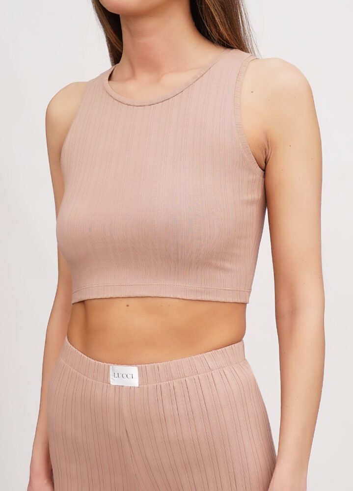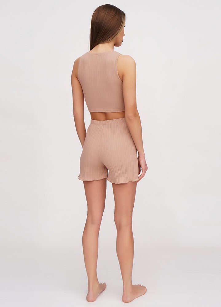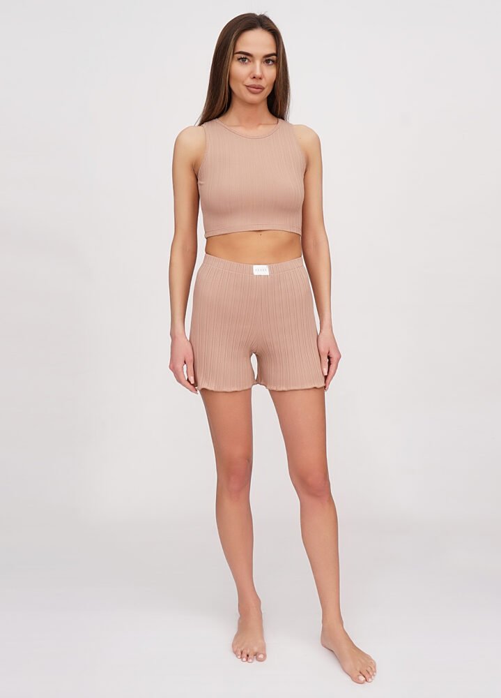 Цей стильний комплект створений для максимального комфорту та свободи рухів у теплу пору року. Виготовлений з якісного трикотажу, що складається з 95% бавовни та 5% еластану, він забезпечує м’якість, дихаючі властивості та легку еластичність. Комплект включає укорочений топ без рукавів та шорти з еластичним поясом, що створюють витончений і невимушений образ.