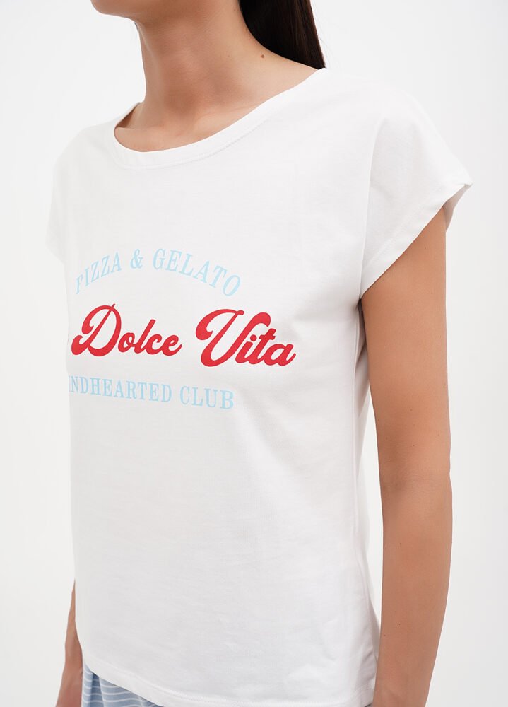 Ця жіноча піжама з кюлотами пропонує вам затишок та стиль для ваших нічних пригод. Футболка прикрашена друкованим малюнком, а рукава та низ оздоблені опіковкою. Виготовлена з бавовни, ця модель забезпечить вам комфорт та свободу рухів.