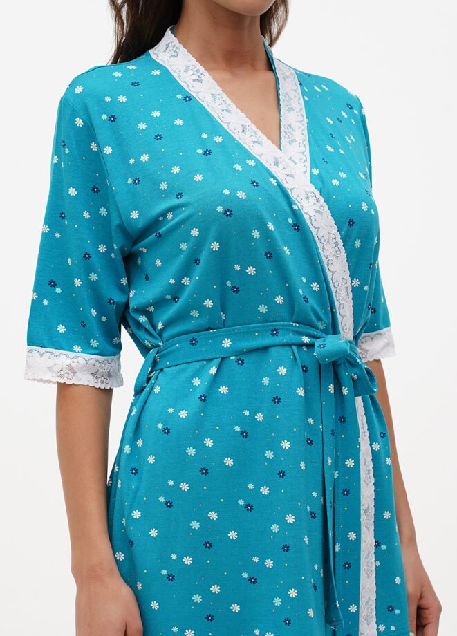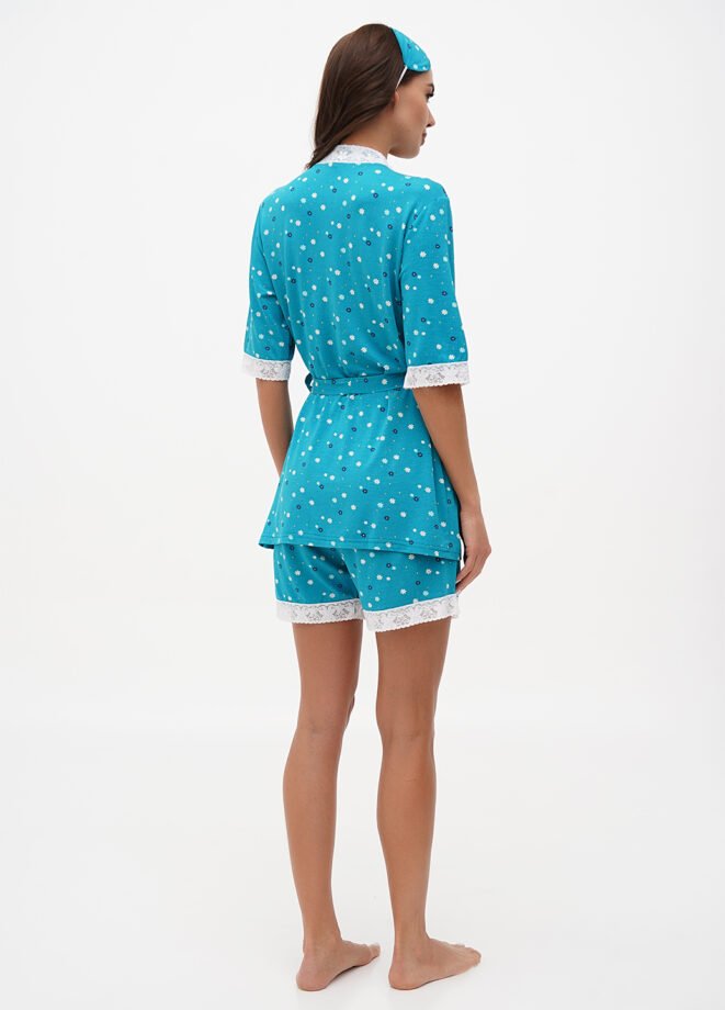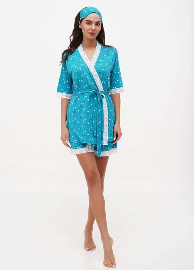 Підкресліть свою жіночність та вишуканість у цій чарівній піжамі з елегантним декором – мереживом. Мереживо на рукавах кофти та низі шорт надає образу ніжності та шарму, даруючи вам відчуття розкоші. Кофта – міні-халатик на запах додає нотку вишуканості та зручності, створюючи ідеальний образ для розслабленого вечора вдома. Насолоджуйтеся відпочинком у цій чудовій піжамі, яка підкреслить ваш стиль та впевненість.