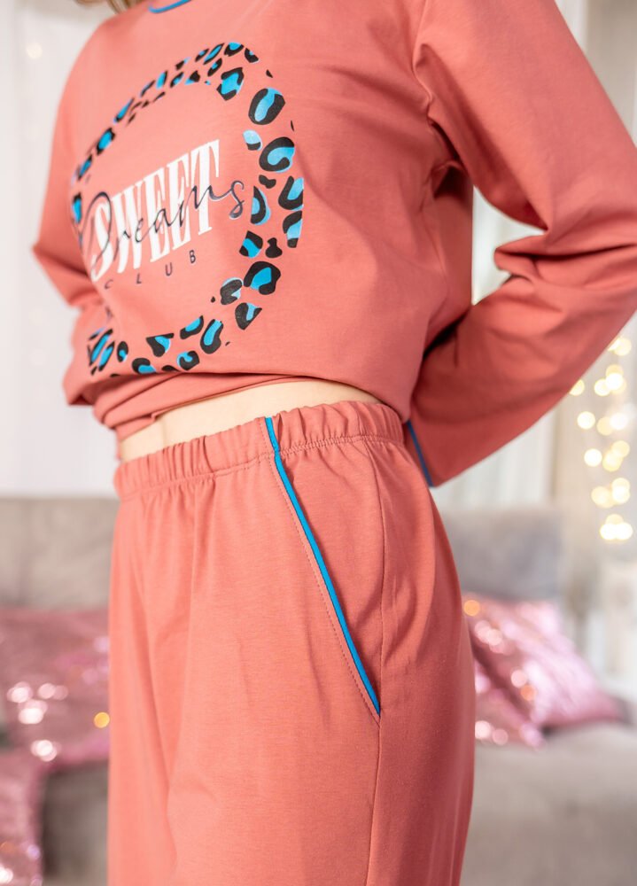 Комфорт і стиль об’єднані в цій ніжно-бірюзовій піжамі, створеній для найсолодших снів. Полотно виготовлено зі стрейч кулиру (95% бавовни, 5% еластану), що забезпечує легкість, еластичність і приємні тактильні відчуття. М’яка тканина ніжно облягає тіло, даруючи відчуття затишку під час сну чи відпочинку вдома. Штани з кишенями.