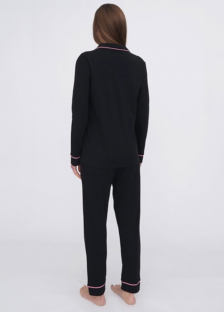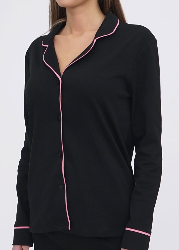 Елегантна жіноча піжама з натурального інтерлоку — поєднання комфорту, стилю та вишуканості. М’яке, щільне полотно з 100% бавовни приємне до тіла, добре «дихає» та ідеально підходить для щоденного використання і сну. Комплект складається з сорочки на ґудзиках з довгим рукавом та зручних штанів прямого крою. Модель представлена у класичних чорних кольорах з різним кантом — для тих, хто цінує жіночність і стиль навіть удома.