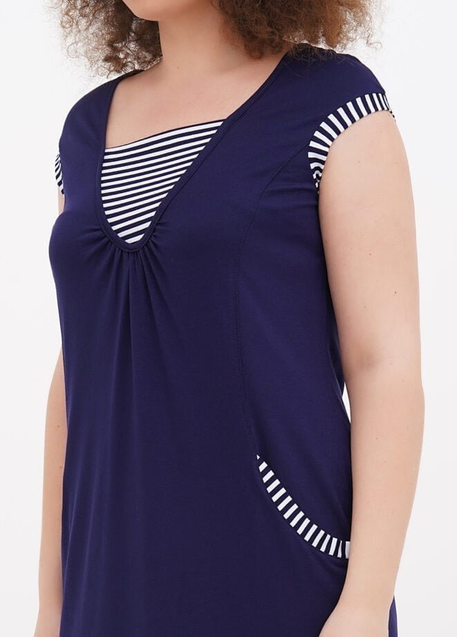 Люблю, коли літній одяг не в обтяжку, тому, з огляду на коментарі брала розмір в розмір. Сіла чудово. Той випадок, коли вільний крій – вільний крій, а не просто завелике, як часто буває з трикотажними сукнями.